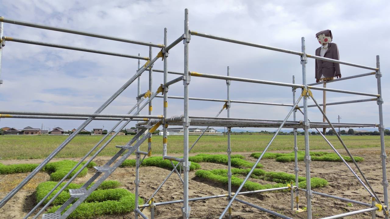 松阪市の「笠松の河津桜」の近くに去年までコスモスが咲いていたところに、なにやら櫓が組まれているのを見つけて行ってみると、上にはカカシが鎮座しています。